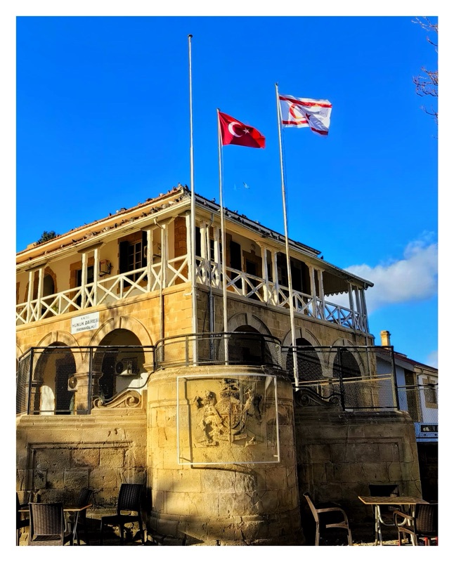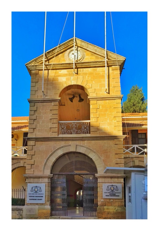 Built during the British administration of Cyprus, this building remained even when legal systems changed — British - Republic of Cyprus - Turkish Republic of Northern Cyprus. The two flags is a clear reflection of the current governance - The Turkish flag and TRNC flag.